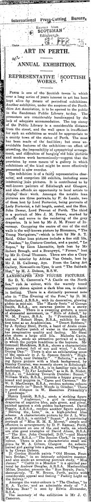 The Scotsman. Three works by de László are on view at the Perthshire annual exhibition, two lent by Lord Forteviot being portraits of Lady Forteviot [5199] and the Hon. John Dewar, Lord Provost of Perth [5273]. The third is a portrait of Mrs J. M. Fraser [4727]. DLA096-0040 and DLA096-0048 are duplicates.