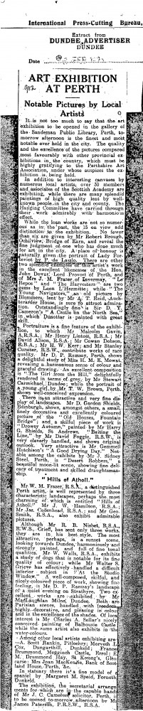 Dundee Advertiser. The exhibition at the gallery of the Sandeman Public Library is of a very high quality. Place of honour is given to de László's portrait of Lady Forteviot [5199]. The artist also exhibits "excellent likenesses" of John Dewar [5273] and Mrs J. M. Fraser [4727]. Duplicate item, see DLA096-0038.