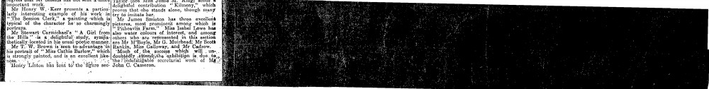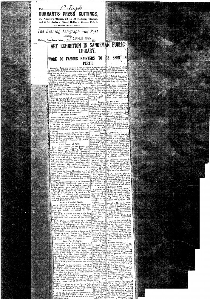 Evening Telegraph and Post. Exhibition at the Sandeman Public Library is praised. Place of honour is given to de László's portrait of Lady Forteviot [5199]. Favourable descriptions of de László's portraits of John Dewar [5273] and Mrs J.M. Fraser [4727].