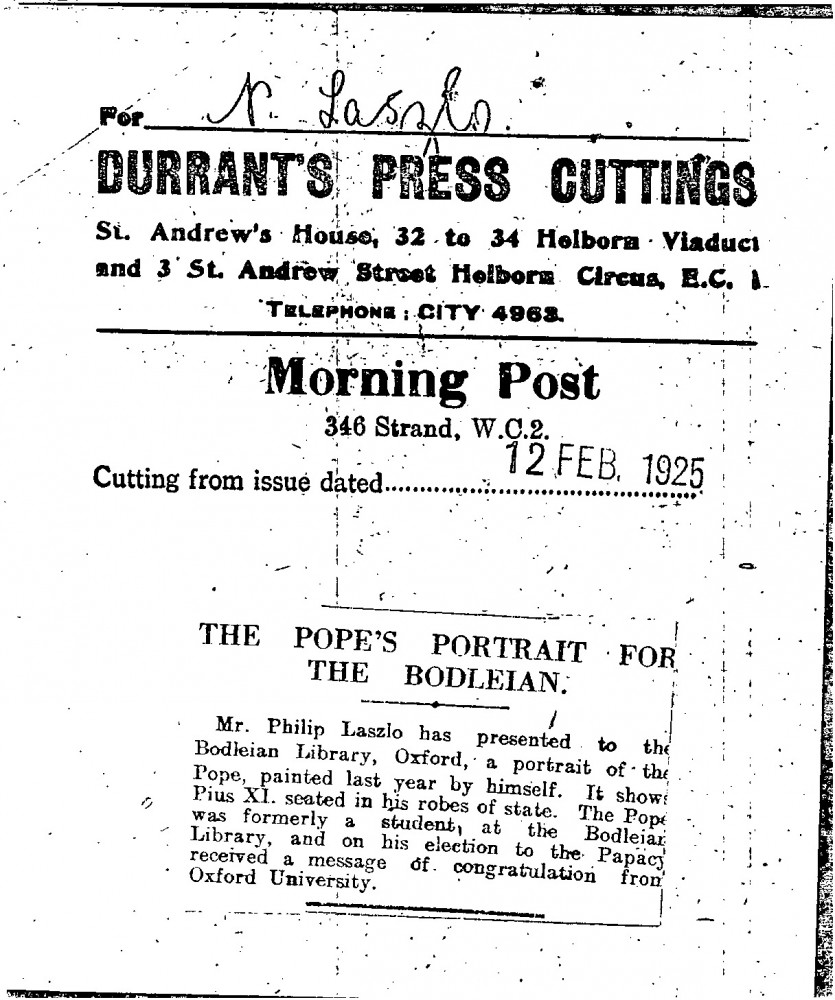 The Morning Post. De László has presented a portrait of Pope Pius XI [6690] to the Bodleian Library, Oxford.
