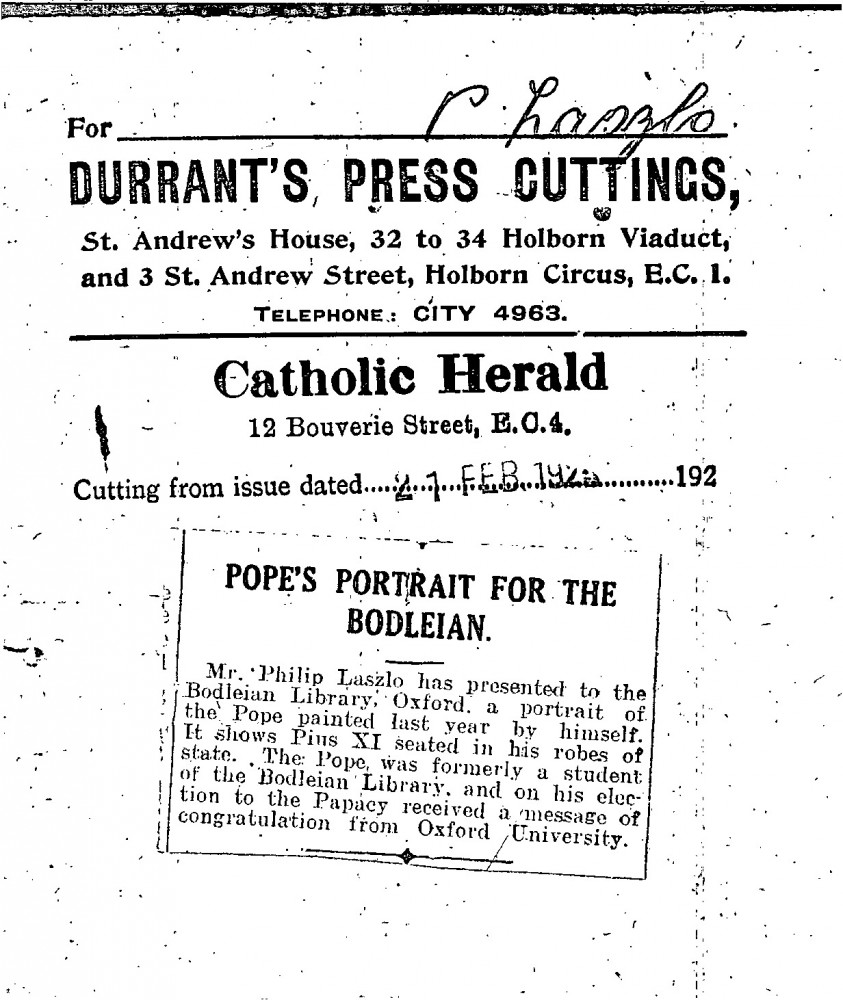 Catholic Herald. De László has presented a portrait of Pope Pius XI [6690] to the Bodleian Library, Oxford. DLA096-0112 is a duplicate of this item.