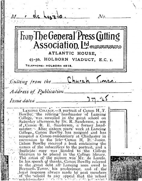 Previous See list Next 096-0076 de Laszlo Archive © de Laszlo Foundation 096-0076 03/09/1925 Church Times. Unveiling of de László's portrait of Canon Bowlby at Lancing College [2507]. Accession number 096-0076 Type Press cutting Location Public Collection, National Portrait Gallery, London Close 096-0076 Miscellaneous Press Cuttings 1925, 096-0076
