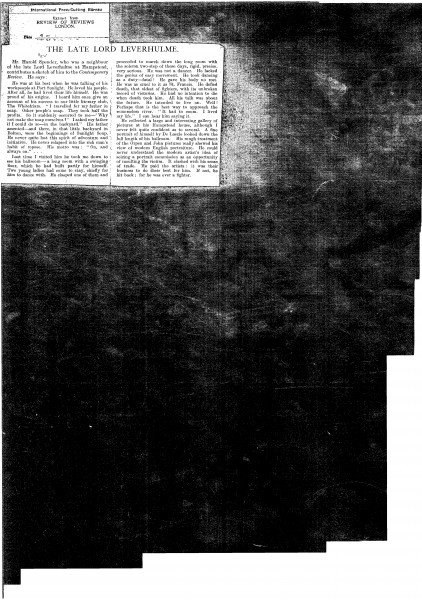 Review of Reviews. Description of Lord Leverhulme's gallery of pictures at his Hampstead house, which includes a "fine portrait" by de László [6043].