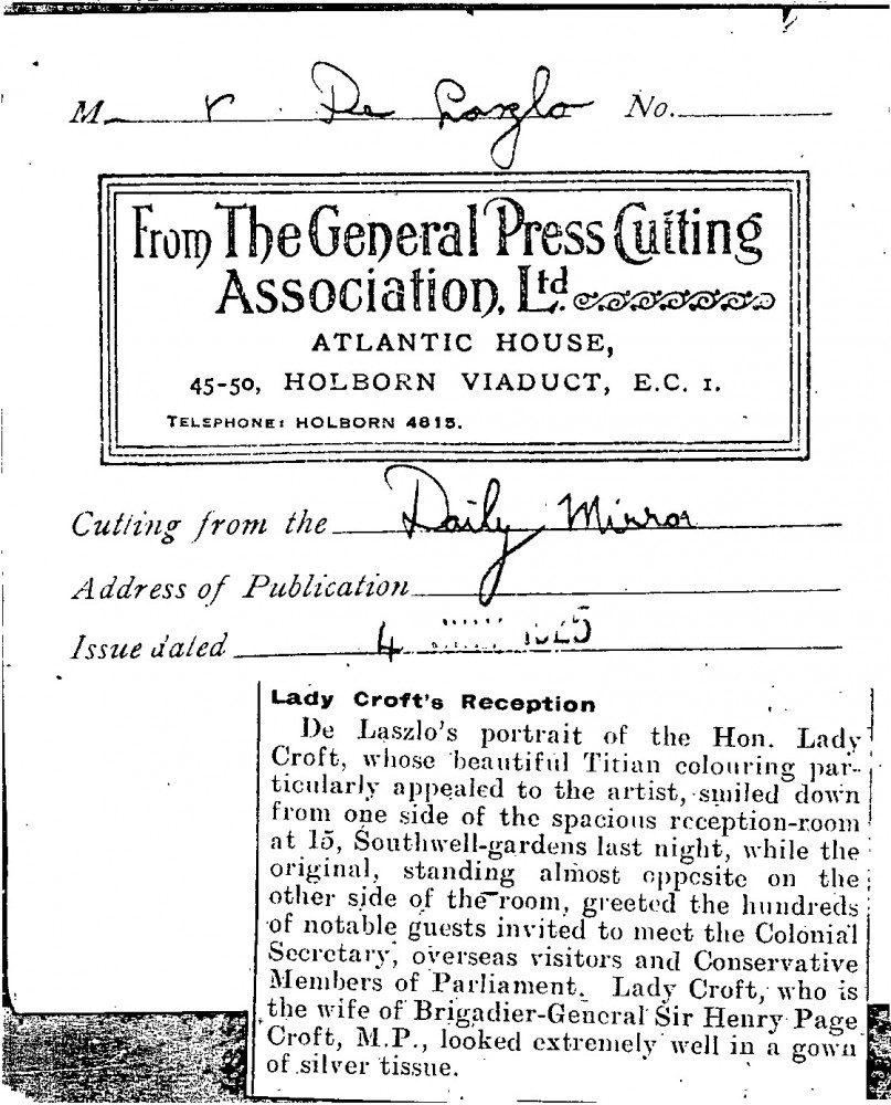 Daily Mirror. Guests were invited to 15 Southwell Gardens last night to meet the Colonial Secretary, overseas visitors and Conservative Members of Parliament. De László's portrait of Lady Croft [4259] hangs in the reception room there.