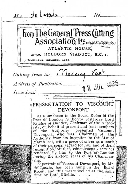 The Morning Post. A de László portrait of Lord Devonport [4570] was unveiled by Lord Ritchie in the Port of London Authority's boardroom as part of a presentation marking Devonport's services as chairman. Article text is verbatim in DLA096-0086, DLA096-0087 and DLA096-0111.