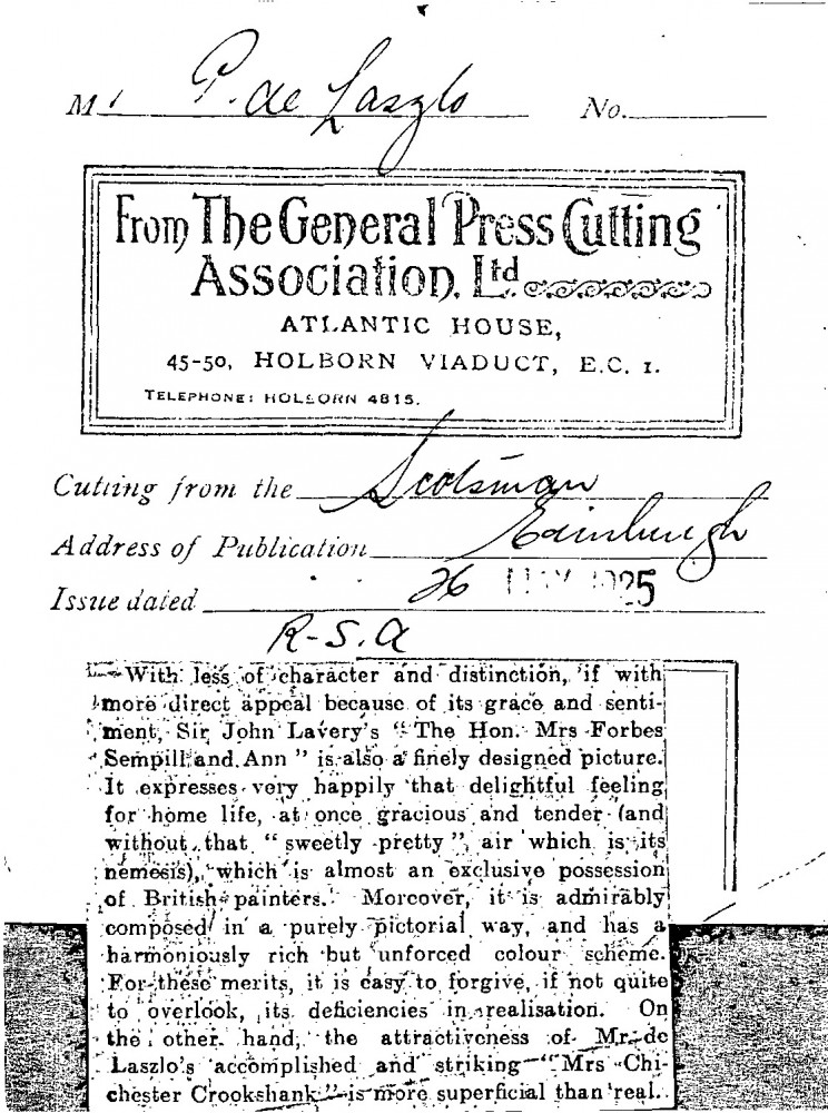 The Scotsman. De László's portrait of Mrs Chichester Crookshank [4130], on view at the Royal Scottish Academy, is described as attractive, accomplished and striking but "more superficial than real".