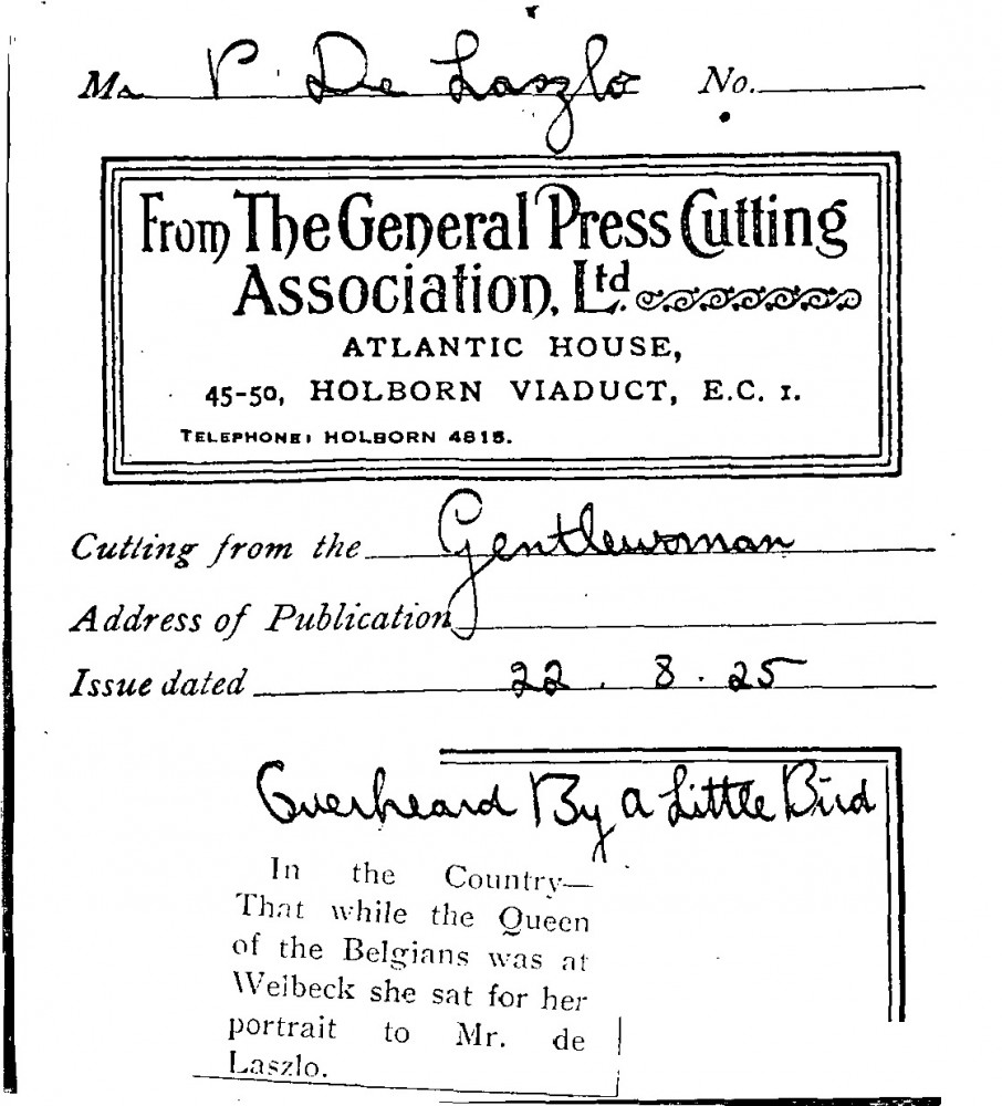 The Gentlewoman. The Queen of the Belgians sat to de László for her portrait [7870] whilst at Welbeck.