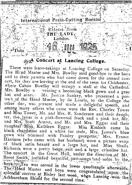 The Lady. Mr Justice Sankey presented Canon Bowlby with his portrait by de László [2507] on his retirement as headmaster of Lancing College. Duplicate DLA096-0088.