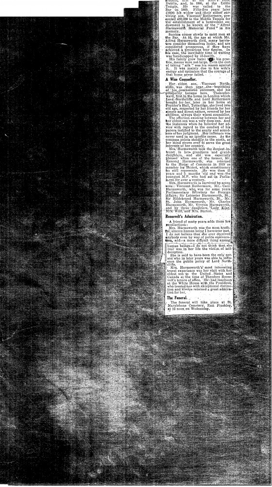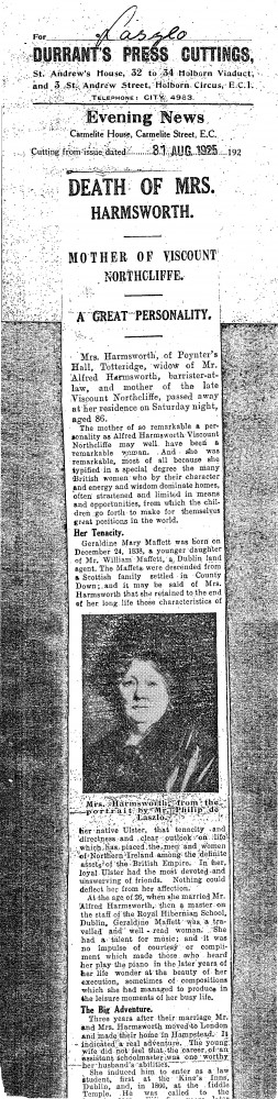 The Evening News. De László's portrait of Mrs Harmsworth [6909], mother of Viscount Northcliffe, illustrates her obituary. Text of DLA096-0107 is nearly identical.
