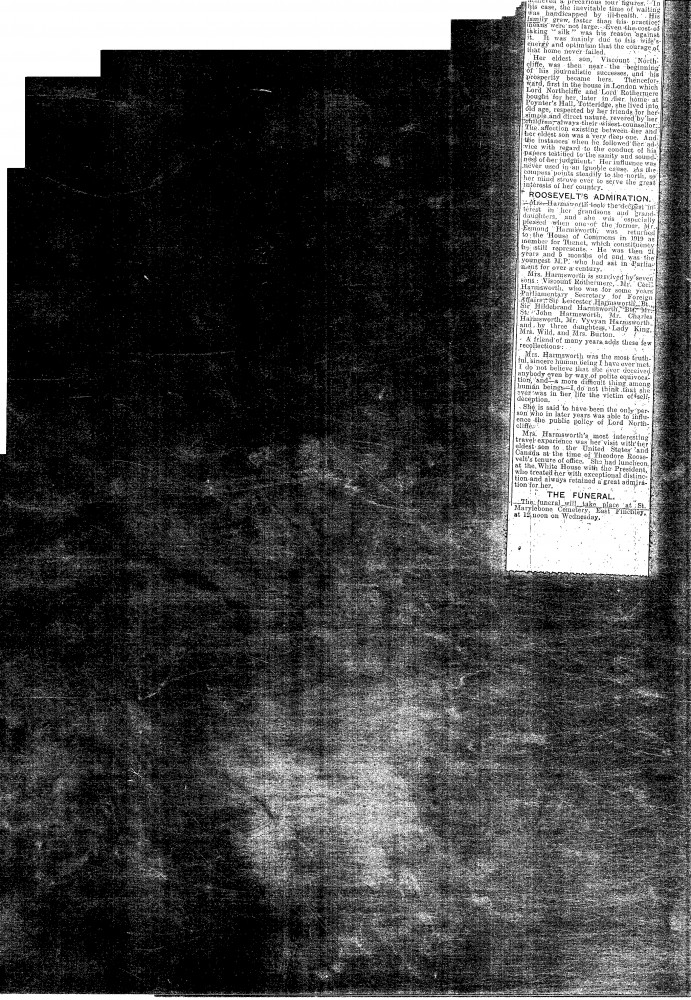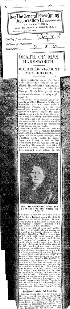 Daily Mail. De László's portrait of the late Mrs Harmsworth [6909], mother of Viscount Northcliffe, illustrates her obituary. See related item DLA096-0106.