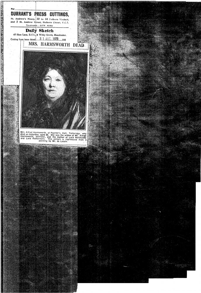 Daily Sketch. De László's portrait of Mrs Harmsworth [6909], mother of Viscount Northcliffe, illustrates the announcement of her death.
