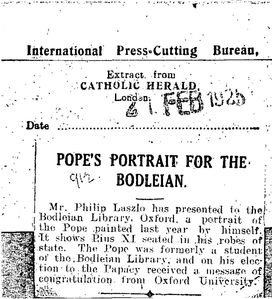 Catholic Herald. De László has presented a portrait of Pope Pius XI [6690] to the Bodleian Library, Oxford. Duplicate of DLA096-0061.