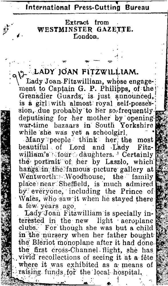 Westminster Gazette. Announcement of Lady Joan Fitzwilliam's engagement to Captain G. P. Philipps; her portrait by de László at Wentworth Woodhouse is much admired. Duplicate of DLA096-0100.