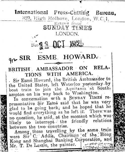 Previous See list Next 096-0150 de Laszlo Archive © de Laszlo Foundation 096-0150 11/10/1925 The Times. De László travelling on the same train as Sir Esmé Howard, British Ambassador to the US. Accession number 096-0150 Type Press cutting Location Public Collection, National Portrait Gallery, London Close 096-0150 Miscellaneous Press Cuttings 1925, 096-0150