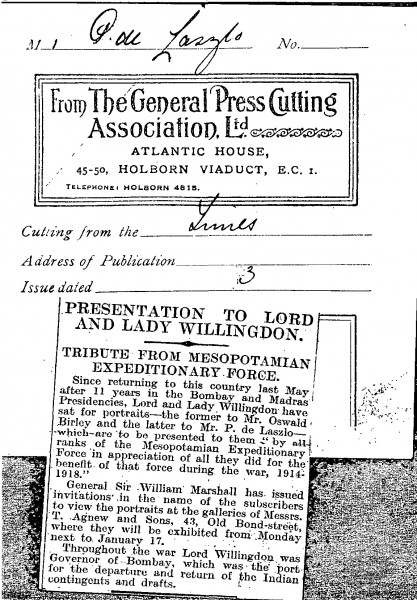 The Times. Portraits of Viscount Willingdon by Oswald Birley and Viscountess Willingdon by de László [7755] will be on view at Agnew's. The portraits were presented to the sitters by ranks of the Mesopotamia Expeditionary Force in appreciation of all they did for the benefit of the Force during the First World War.