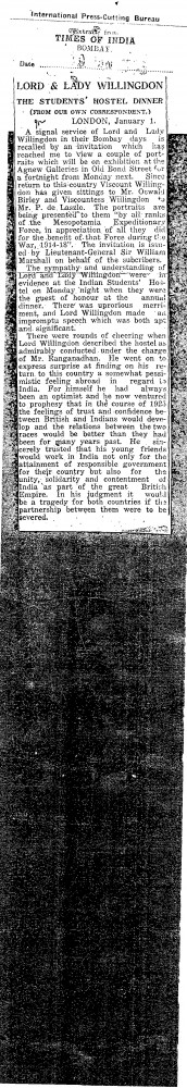 Times of India. Portraits of Viscount Willingdon by Oswald Birley and Viscountess Willingdon by de László [7755] will be on view at Agnew's. The portraits were presented to the sitters by ranks of the Mesopotamia Expeditionary Force in appreciation of all they did for the benefit of the Force during the First World War.