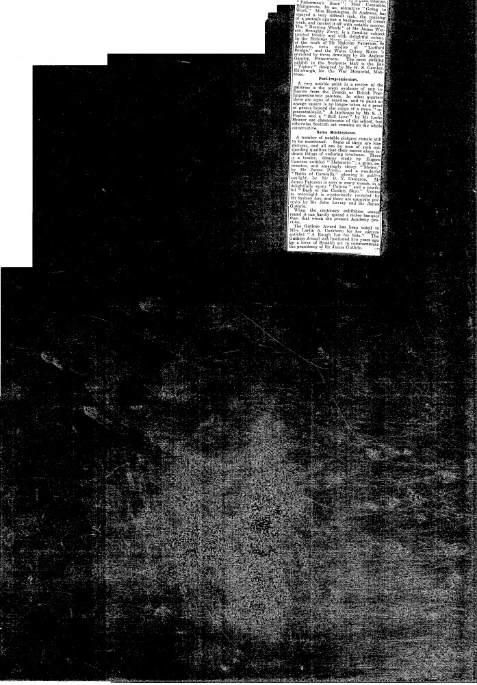 Dundee Courier. Description of de László's portrait of Mrs Crookshank [4130], with its wonderfully textured, "gorgeous shawl", on view at the Royal Scottish Academy's annual exhibition.