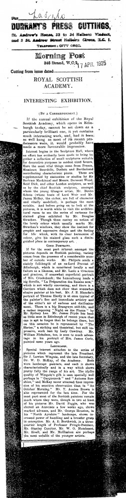 Morning Post. De László's portrait of Mrs Chichester Crookshank [4130], on view at the Royal Scottish Academy, is considered "vivacious and gracious, if somewhat artificial."