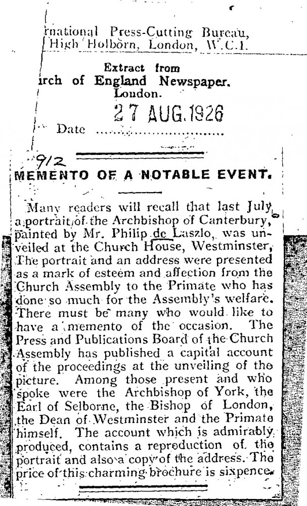The Church of England Newspaper. Publication of a brochure by the Church Assembly to commemorate the unveiling of de László's portrait of the Archbishop of Canterbury at Church House [4632].