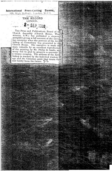 The Record. The Press and Publications Board of the Church Assembly is publishing a souvenir pamphlet commemorating the unveiling of de László's portrait of the Archbishop of Canterbury at the Church House [4632]. Duplicate of DLA097-0091.