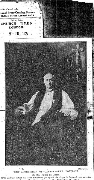 Church Times. Illustration of de László's portrait of the Archbishop of Canterbury [4632], which was unveiled at the Church House by the Archbishop of York.