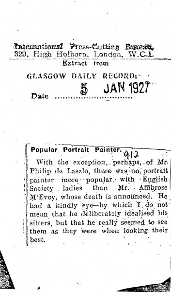 Glasgow Daily Record. Announcement of Ambrose McEvoy's death. Other than de László, there was no portraitist more popular with English society ladies than McEvoy.