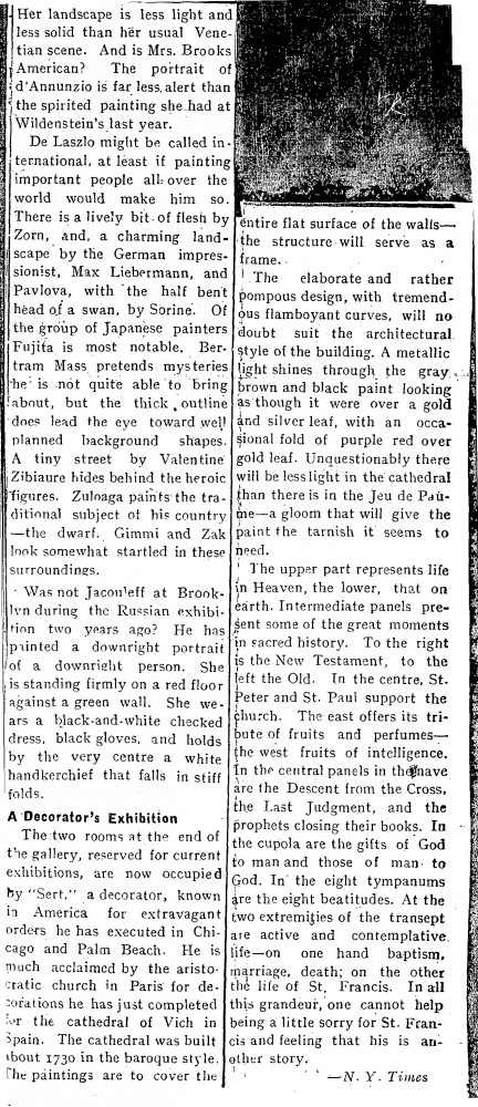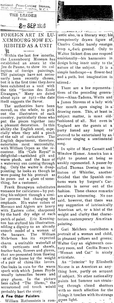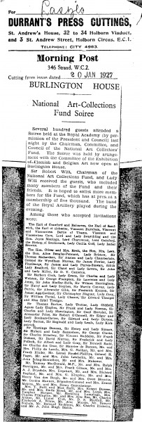 Multiple press cuttings. The Morning Post. The de Lászlós attended a soirée held by the National Art Collectors’ Fund at the Royal Academy before the Flemish and Belgian art exhibition at Burlington House. The Leader. Review of the "foreign art" exhibition at the Jeu de Paume. Brief mention of de László, who "might be called international, at least if painting important people all over the world would make him so."