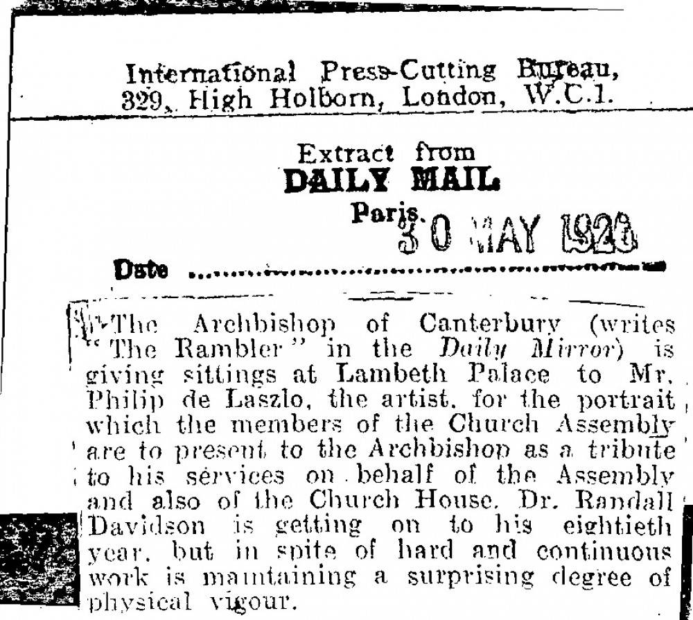 Daily Mail. The Archbishop of Canterbury is giving sittings to de László for a portrait [4632] which members of the Church Assembly will present to the Archbishop.