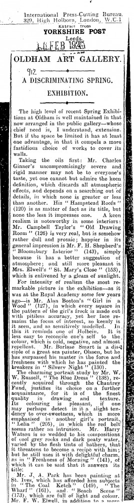 The Yorkshire Post. Review of Spring Exhibition, Oldham. Passing reference to de László; the article mentions Wilfrid Gabriel de Glehn’s portrait of his wife, which “reminds one of that virtuoso in paint, Laszlo.”