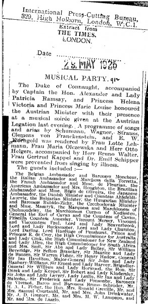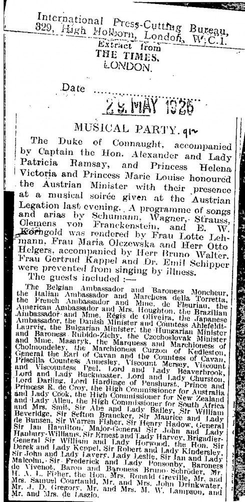 Previous See list Next 097-0173 097-0173 29/05/1926 The Times. The de Lászlós are named among the guests at a musical soirée held at the Austrian Legation. Accession number 097-0173 Type Press cutting Location Public Collection, National Portrait Gallery, London Close 097-0173 Miscellaneous Press Cuttings 1926-1927, 097-0173