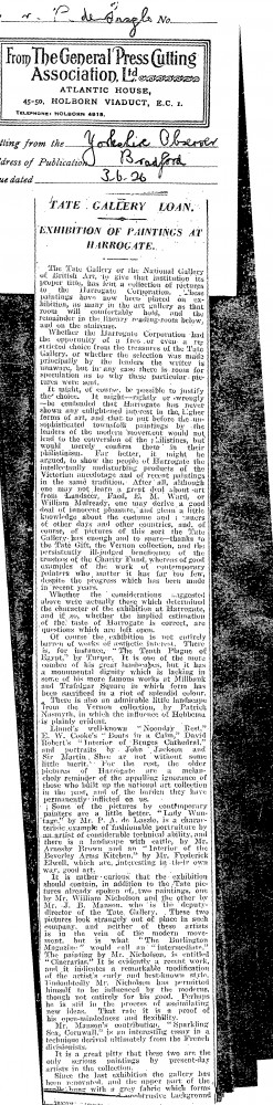 Yorkshire Observer. Review of an exhibition of pictures lent by the Tate Gallery to the Harrogate Corporation. Amongst them is de László's portrait of Lady Wantage [11384], "a characteristic example of fashionable portraiture by an artist of considerable technical ability." Duplicate of DLA097-0140.