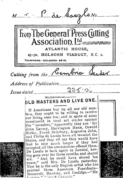 Cambria Leader. British artists are receiving large numbers of commissions in the US. Lucy de László quoted as saying that de László, who went to the US for three months but stayed for six, could have remained for ten years. Text in DLA097-0168, DLA097-0169 and DLA097-0184 is almost verbatim.