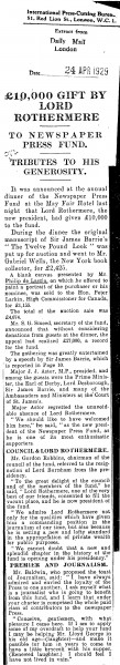 Daily Mail. At last night's annual dinner of the Newspaper Press Fund, a blank canvas presented by de László, on which he offered to paint a portrait of the purchaser or his nominee, was sold to the Hon. Peter Larkin, High Commissioner for Canada, for £1,155 [6007].