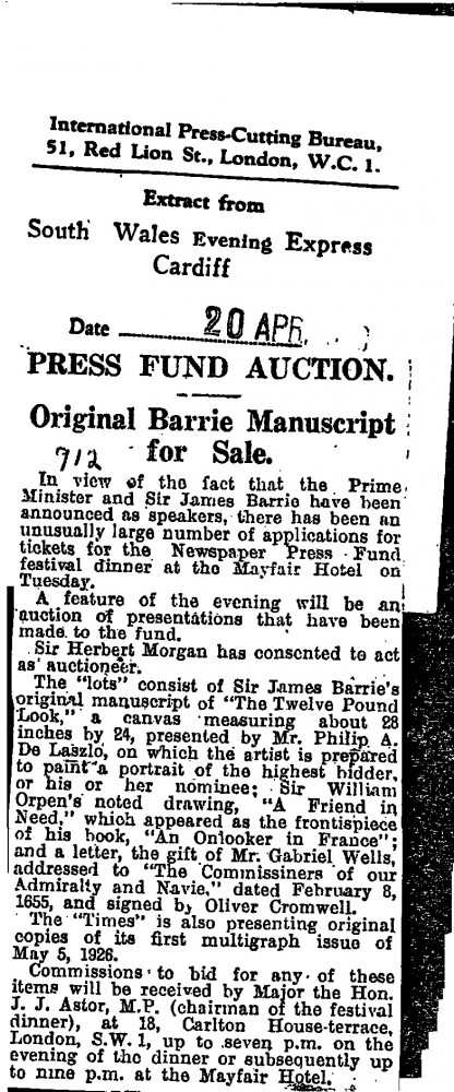 South Wales Evening Express. At a forthcoming fundraiser for the Newspaper Press Fund, de László will donate a “blank canvas” upon which he will paint the portrait of the highest bidder or his or her nominee [6007].