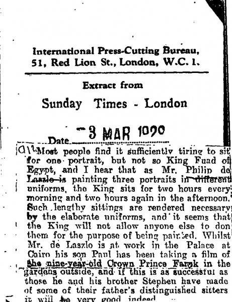 Sunday Times. De László is painting three portraits in different uniforms of King Fuad of Egypt [4094][113256][110671]; the sittings are lengthy. The artist's son Paul has been filming the King's son Prince Farouk in the gardens.