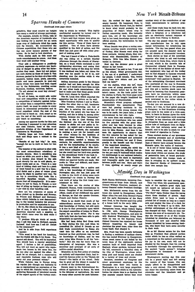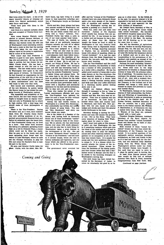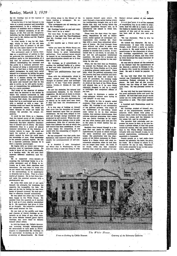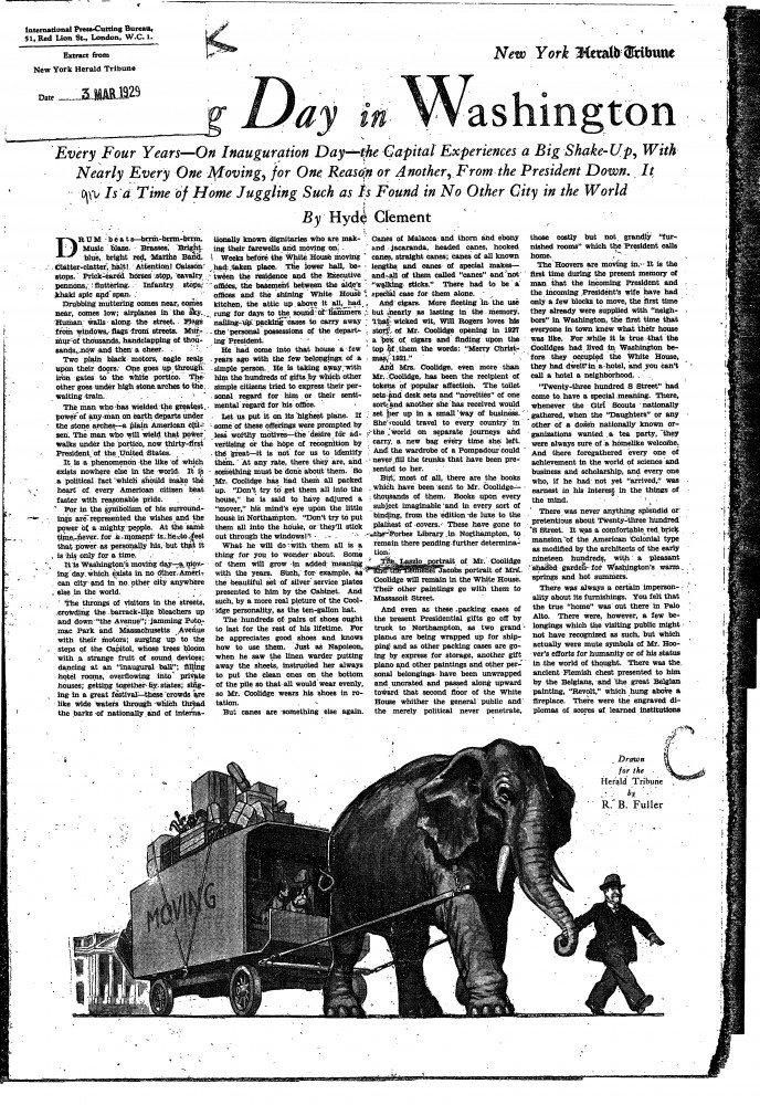 New York Herald Tribune. As President and Mrs. Calvin Cooldige prepare to move out of the White House, their plans and the plans for their various effects are discussed in this article, which notes that “The Laszlo portrait of Mr. Coolidge [4169] . . . will remain in the White House."