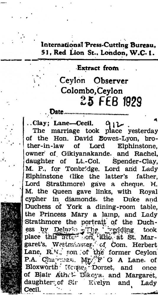 Ceylon Observer. The marriage took place yesterday of the Hon. David Bowes-Lyon and Rachel, daughter of Lt.-Col. Spender-Clay. Description of wedding gifts, including de László's portrait of the Duchess of York [4460] given by the Countess of Strathmore.