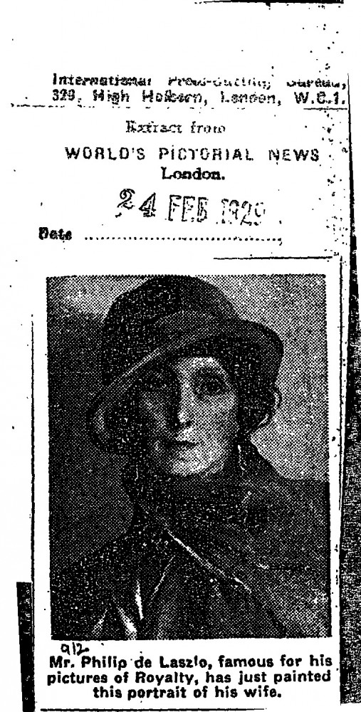 World’s Pictorial News. De László has just painted a portrait of his wife; illustration of the portrait [13210] accompanies the report.