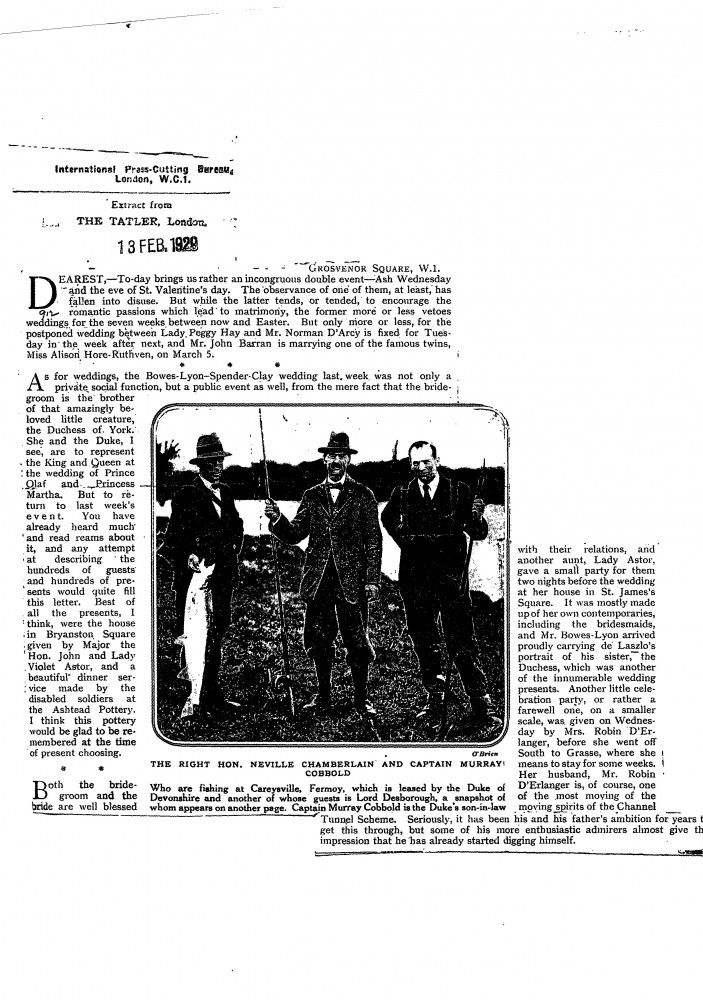 Tatler. Lady Astor held a reception at her home in St James’s Square prior to David Bowes-Lyon's wedding. He “arrived proudly carrying de Laszlo's portrait of his sister, the Duchess" [4460].