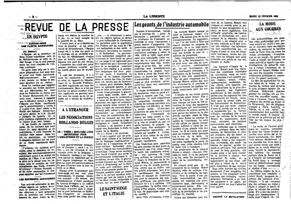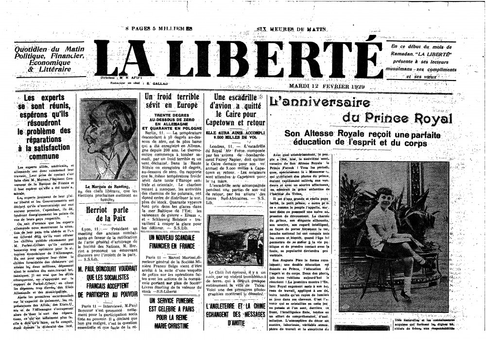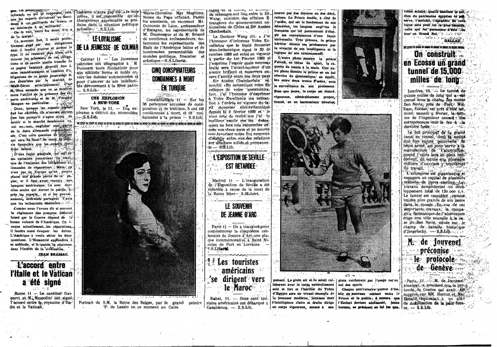 La Liberté. Reproduction of de László's portrait of Queen Elisabeth of Belgium [7870], with a caption noting that the artist is currently in Cairo [page 2 of PDF].