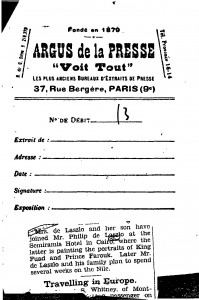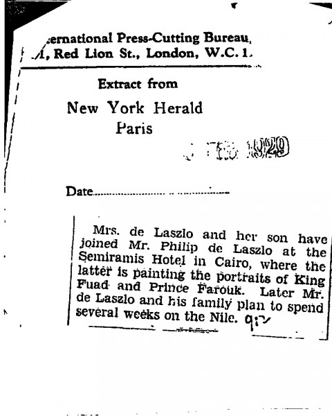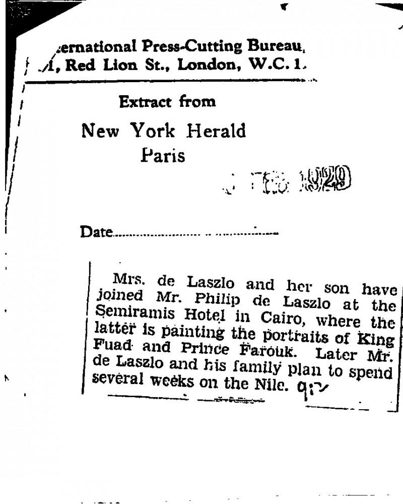 New York Herald Tribune. Lucy and Paul de László have arrived in Cairo, where de László is painting portraits of King Fuad [4094][113256][110671][4099] and Prince Farouk [4122]. They will travel in Egypt thereafter.