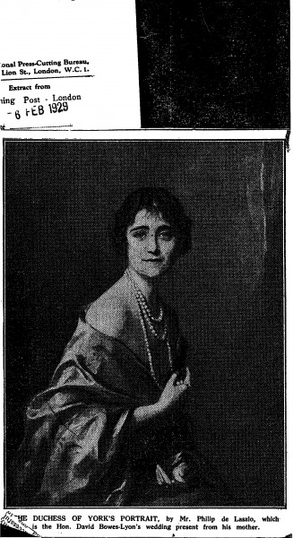 The Morning Post. Illustration of de László's portrait of the Duchess of York [4460], given to David Bowes Lyon as a wedding present from his mother.