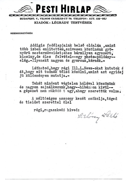 Siklóssy expresses eagerness to publish photographs of de László's work, enclosing material found in the Illustrated London News for reference. He apologises for technical issues with their printing machines.