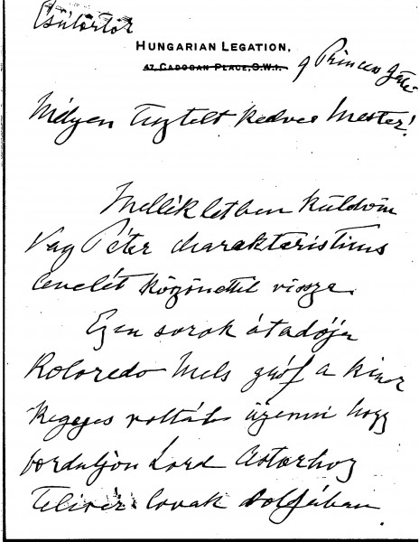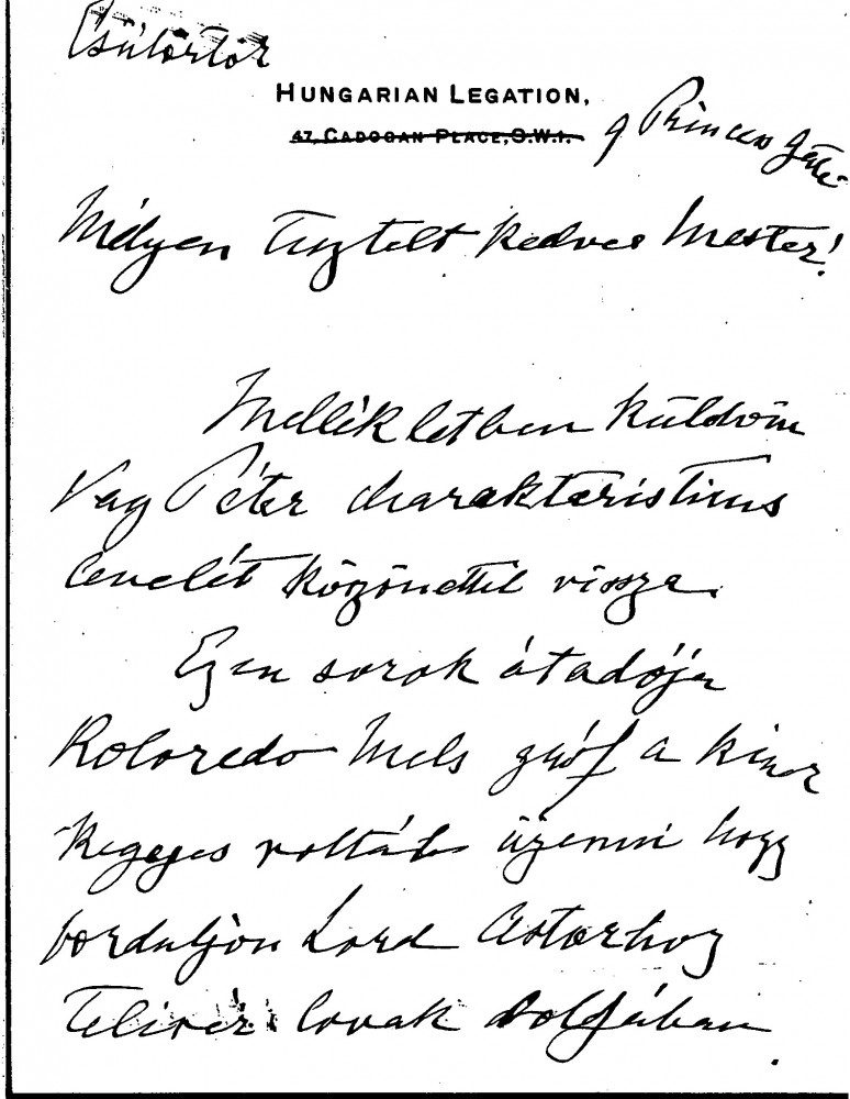 Count László Szapáry is returning a letter of Péter Vay's to de László. Szapáry writes that Count Coloredo Mels should contact Lord Astor regarding thoroughbred horses