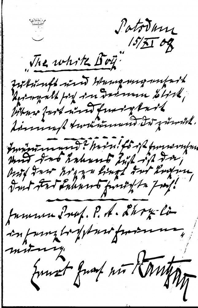 Poem, "The White Boy", dedicated "in fondest memory" to de László from Count Ernst Ludwig Emil zu Rantzau (for another version of the poem, see DLA029-0034) (DLA015-0080 was previously archived with this item. DLA015-0080 ref'd in Hart-Davis as DLA015-0023, ch1, p4, fn14, notes p288)