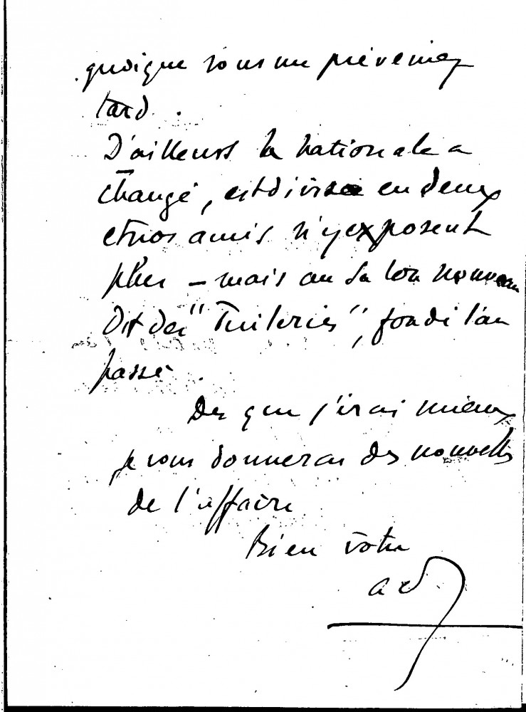 Letter from André Dézarrois suggesting that de László send his painting to the National Salon notwithstanding the short notice. Dézarrois mentions that his and de László's friends no longer exhibit at the "National", but at the recently founded Salon des Tuileries
