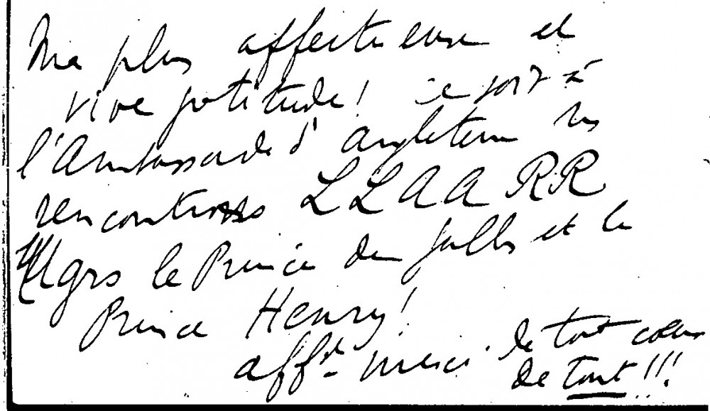 Letter from the duchesse de Gramont thanking de László for a rosary, a medal and some photographs. She just met the Prince of Wales and Prince Henry at the English Embassy