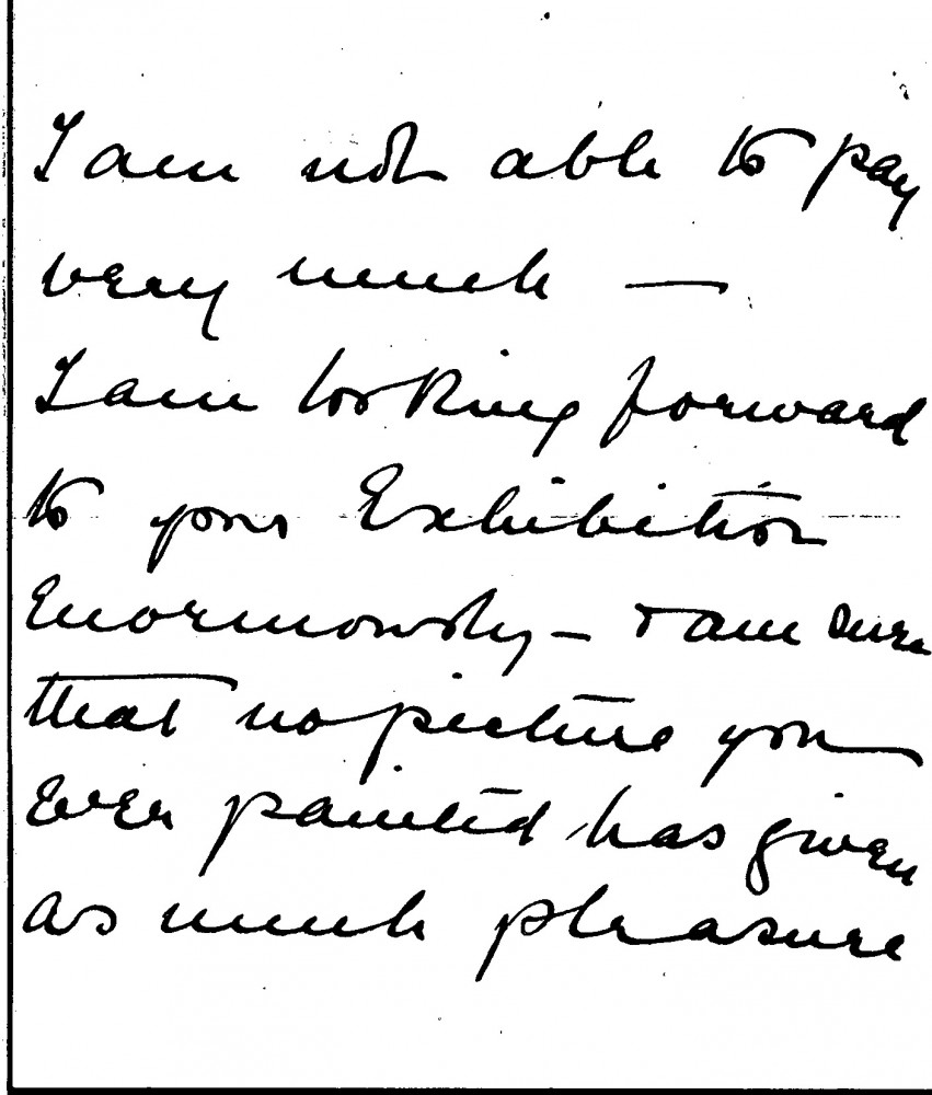 Letter from Lady Annie Lawley to de László thanking the artist for sending her Frederick Cullen's address. She will write to Cullen (presumably to commission a copy portrait of de László's portrait of her husband [6011]), but she is unable to pay very much. She is looking forward to de László's exhibition at the French Gallery, and she writes of the pleasure [6011] brings her