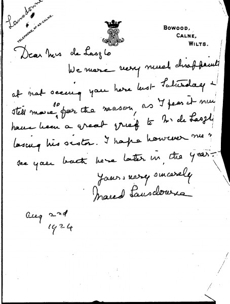 Letter from Maud, Marchioness of Lansdowne to Lucy conveying her disappointment that she (Lucy) could not attend a recent party. She sends condolences to de László on the death of his sister, Paula (known as Pauline)