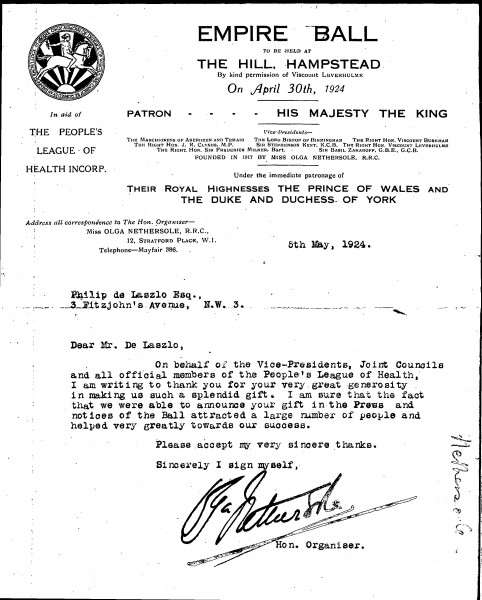 Letter from Olga Nethersole thanking de László for his "very great generosity" in agreeing to paint the winner of the costume pageant at the Empire Ball [13294]
